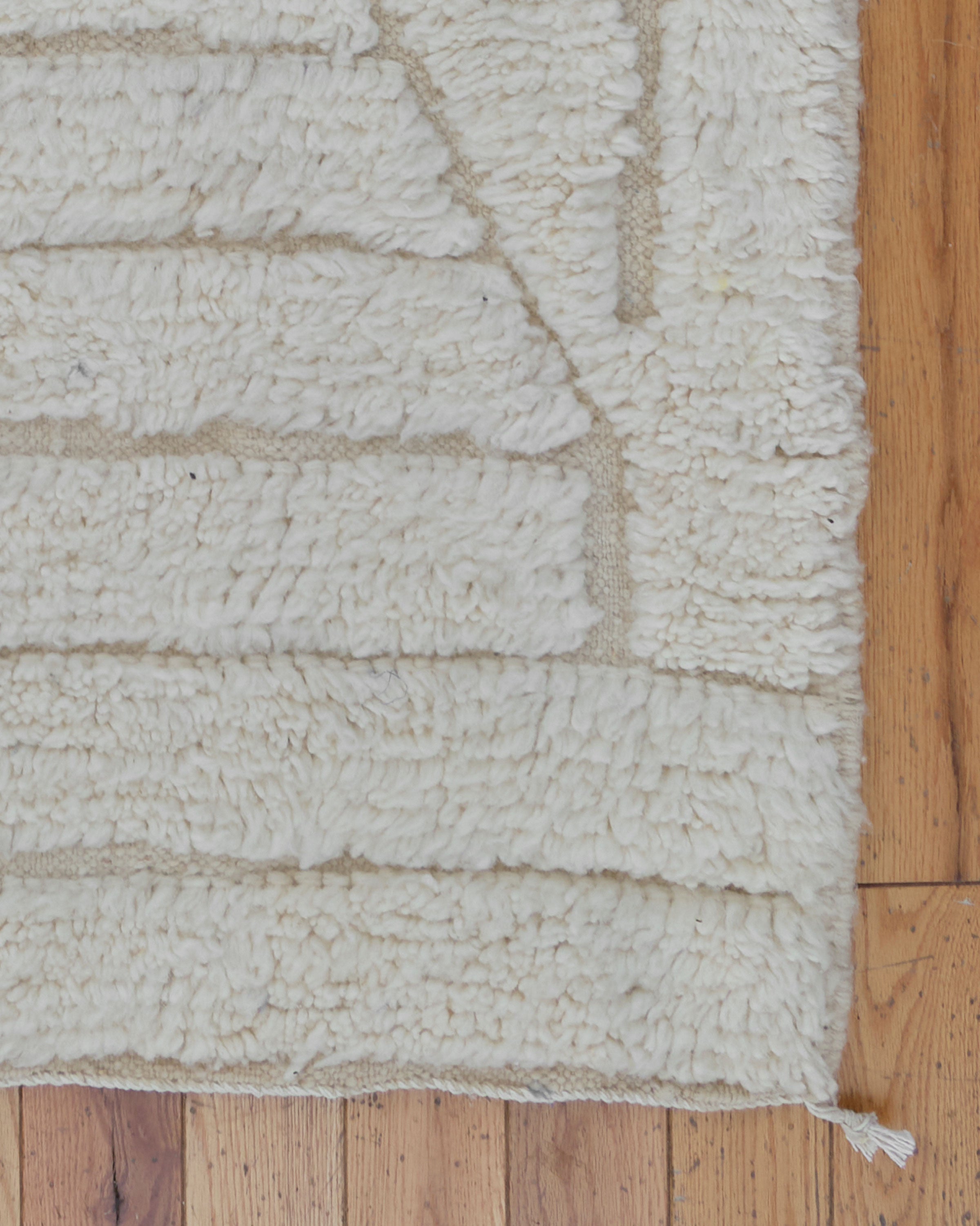 Beni Ouarain rugs are traditional Moroccan handwoven carpets made by the Berber tribes in the Atlas Mountains. Known for their thick, woolen texture and minimalist geometric designs, typically in black on a cream background, these rugs are both cozy and stylish. They are highly prized for their craftsmanship, durability, and ability to complement a variety of interior styles.